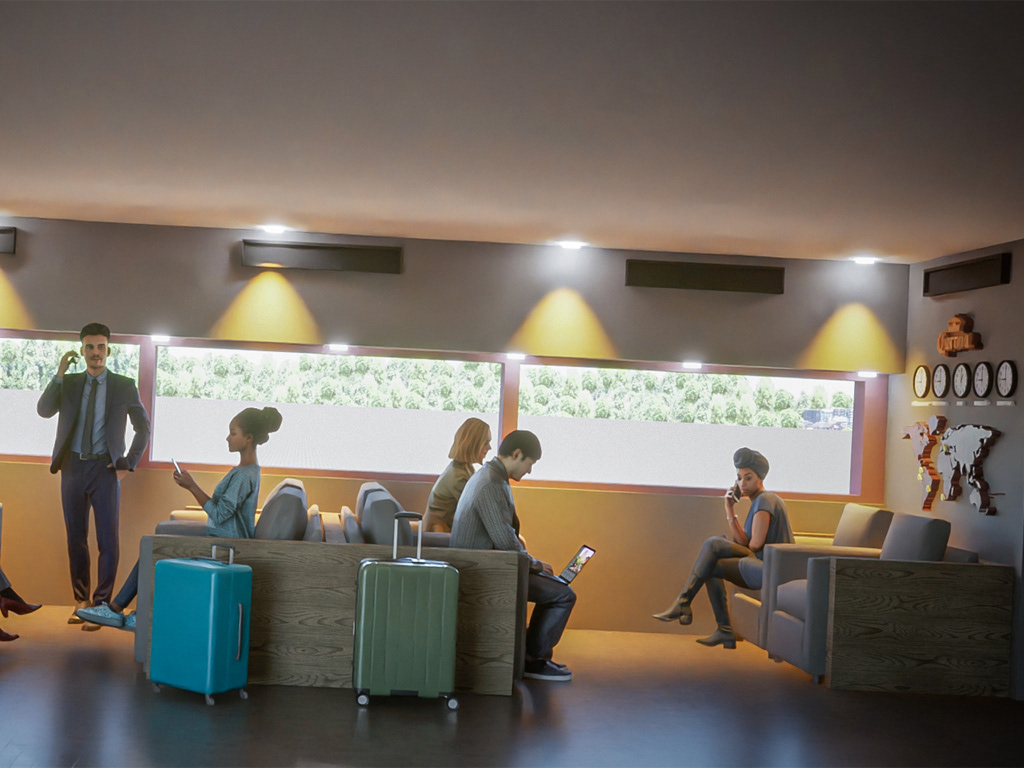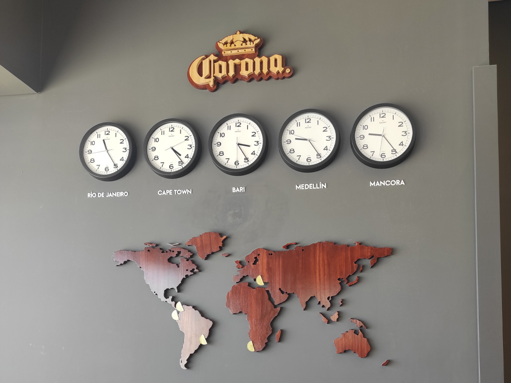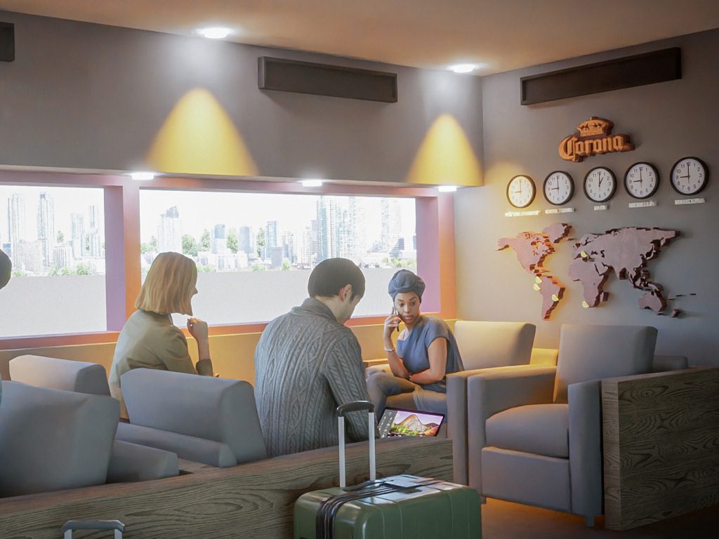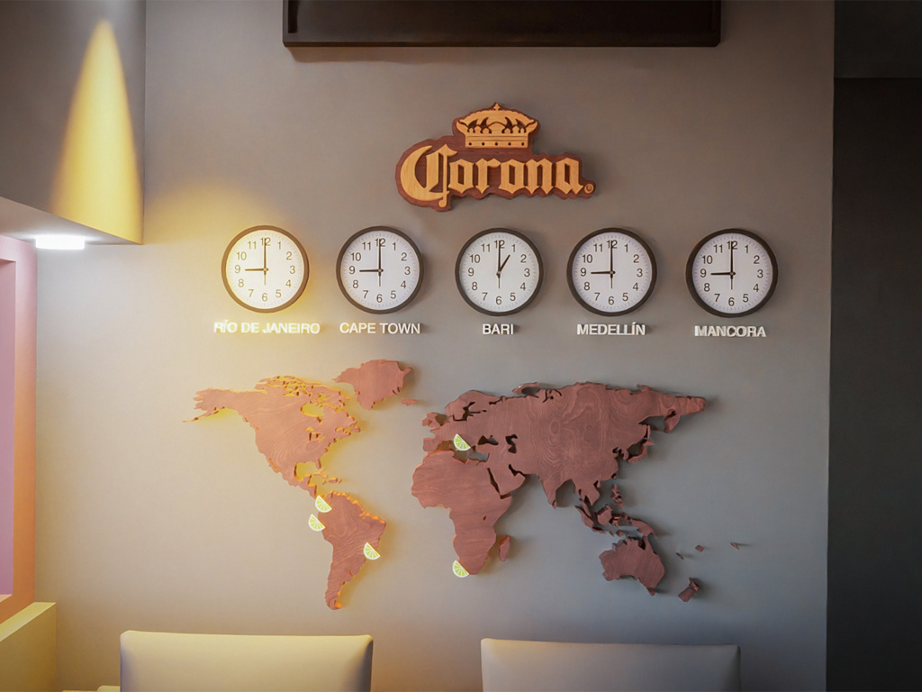 Espacio Corona para VIP Lounge del Aeropuerto Silvio Pettirossi, mostrando horarios y locación de playas relacionadas con el espíritu de la marca.
