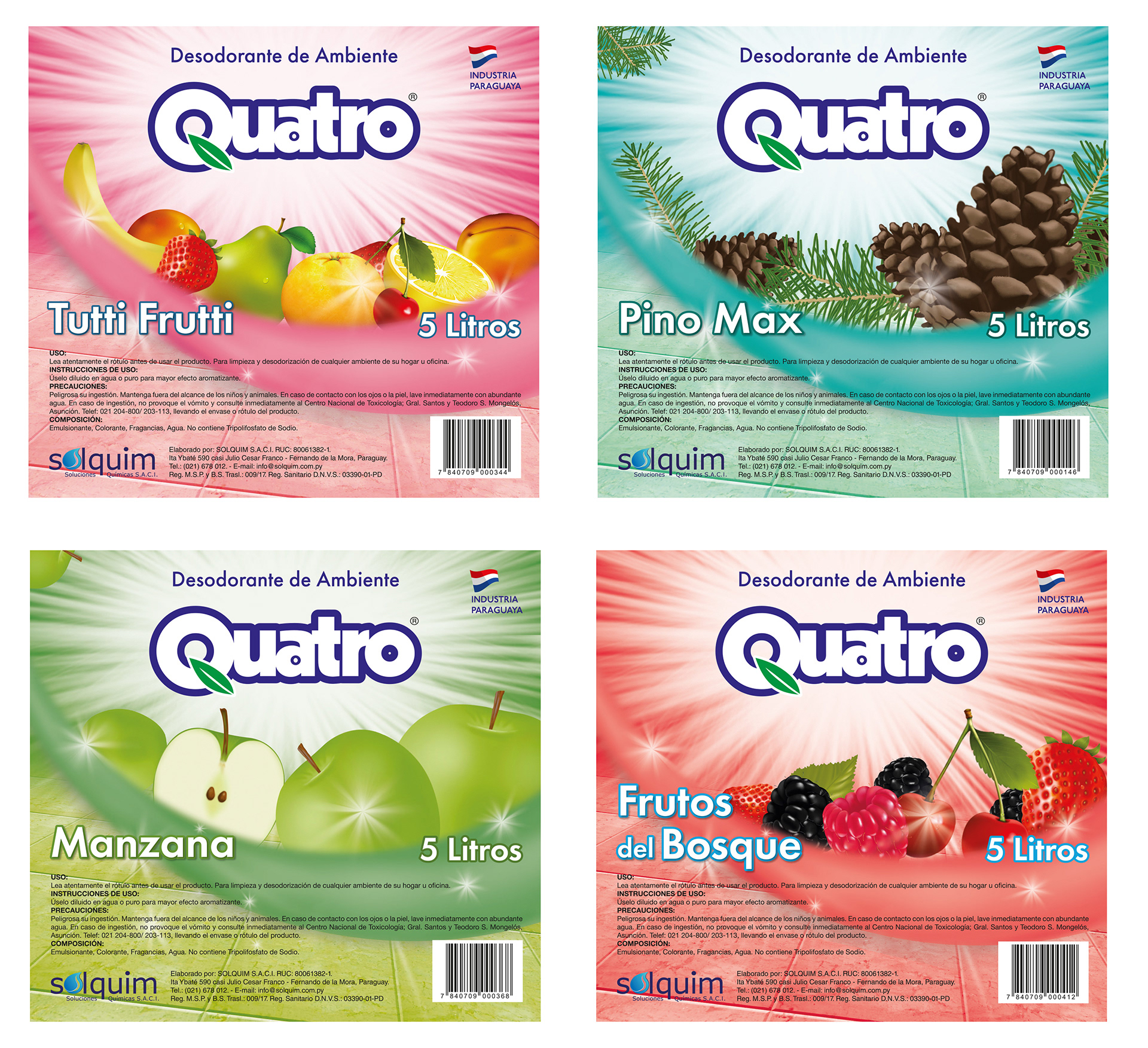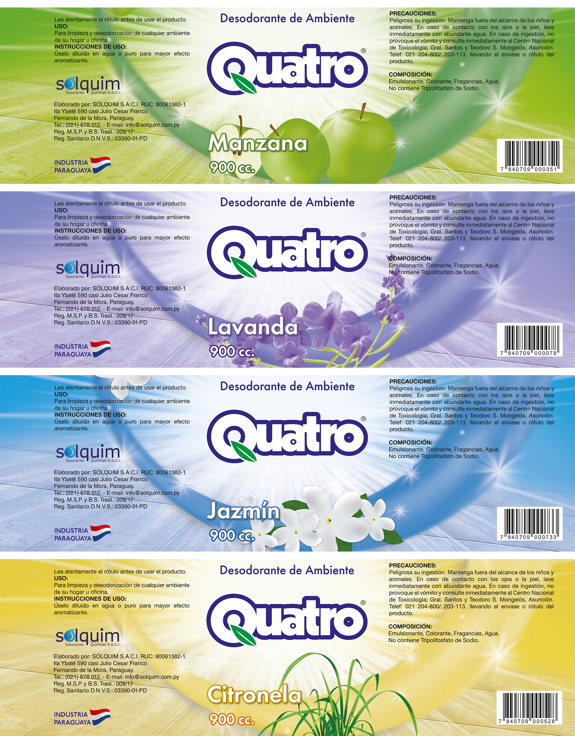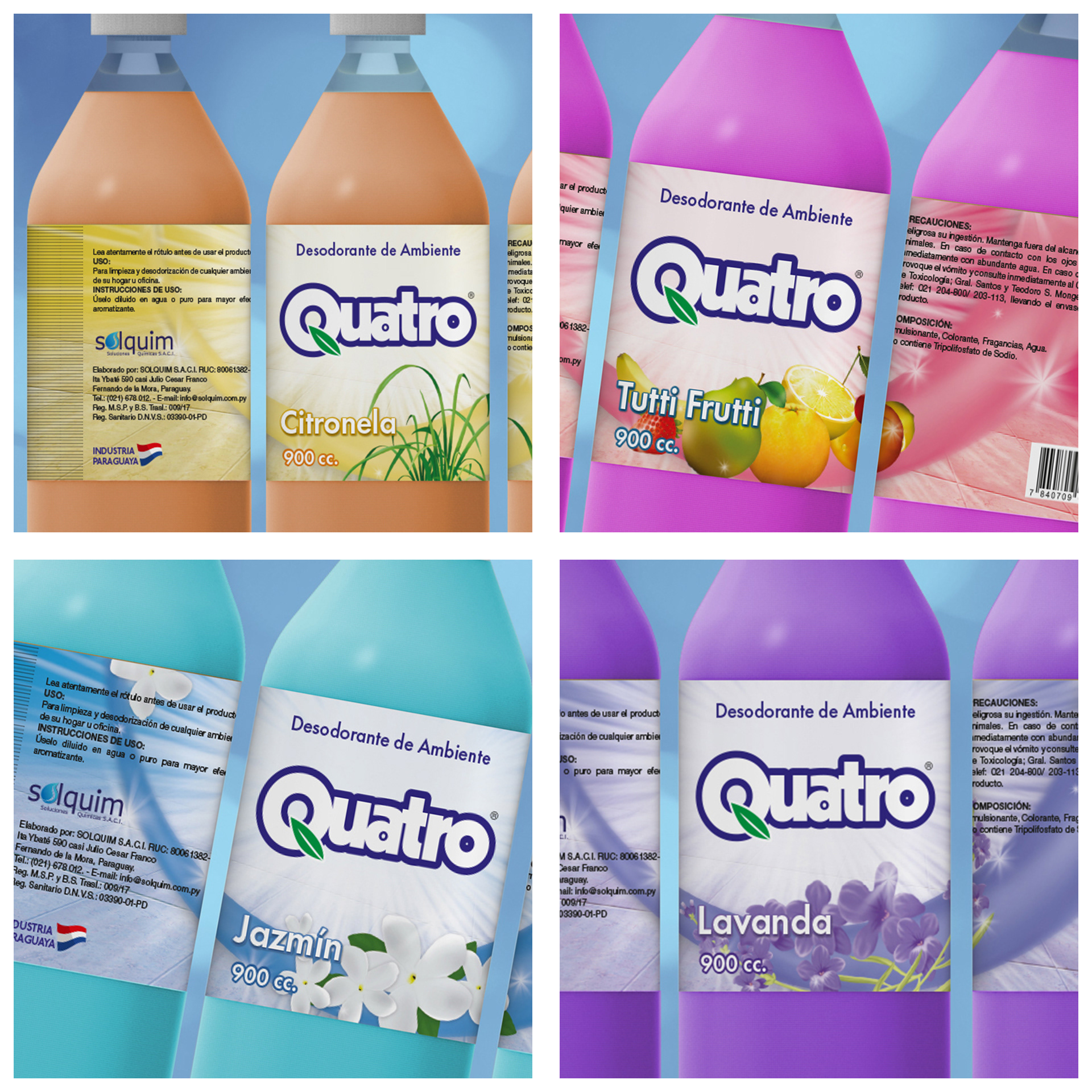 Diseño de etiquetas para la línea de Desodorantes para Ambientes QUATRO, donde cada elemento fue dibujado digitalmente para un mayor impacto y reconocimiento.