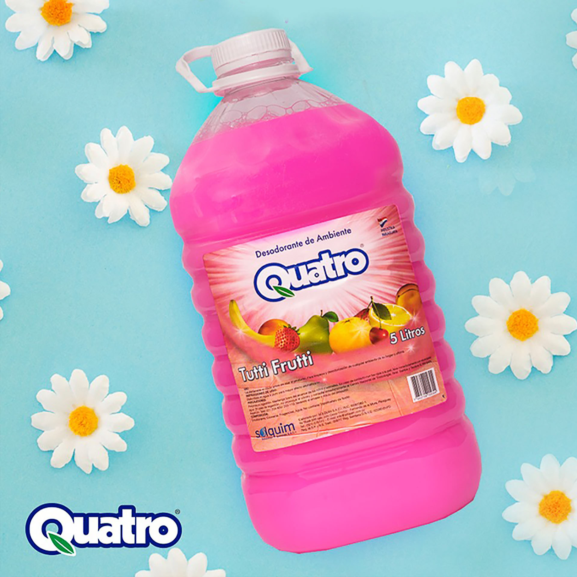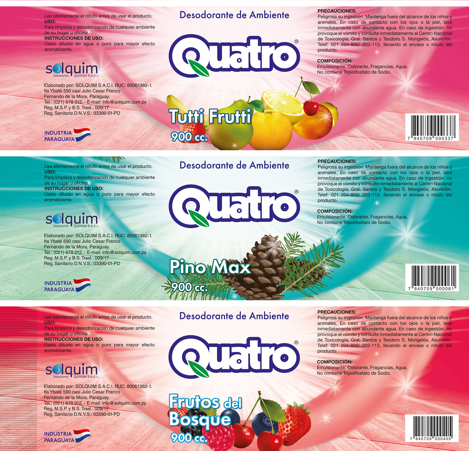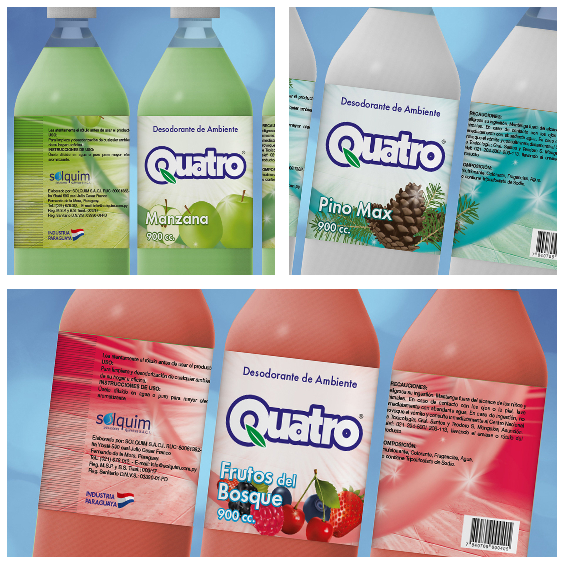 Diseño de etiquetas para la línea de Desodorantes para Ambientes QUATRO, donde cada elemento fue dibujado digitalmente para un mayor impacto y reconocimiento.