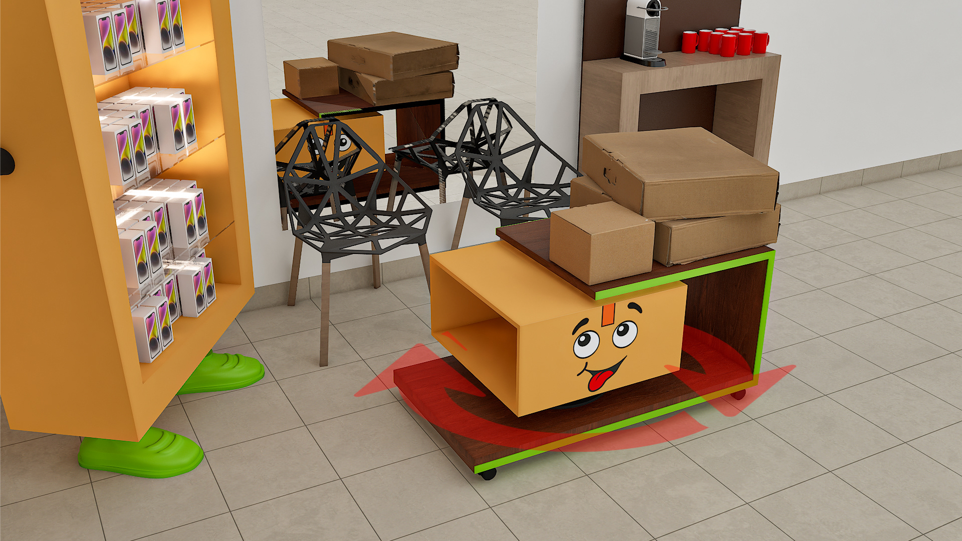 Diseño de mesa giratoria, totem y alfombras para el unboxing spot, sector donde los clientes podrán revisar los paquetes recibidos de una forma cómoda y segura.