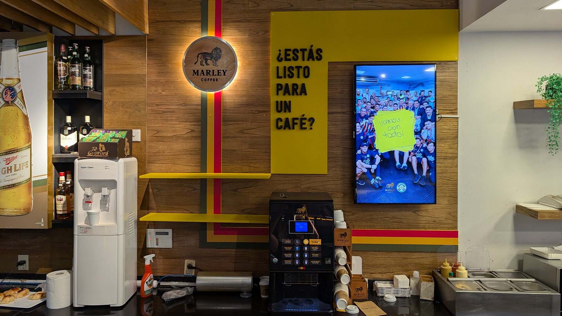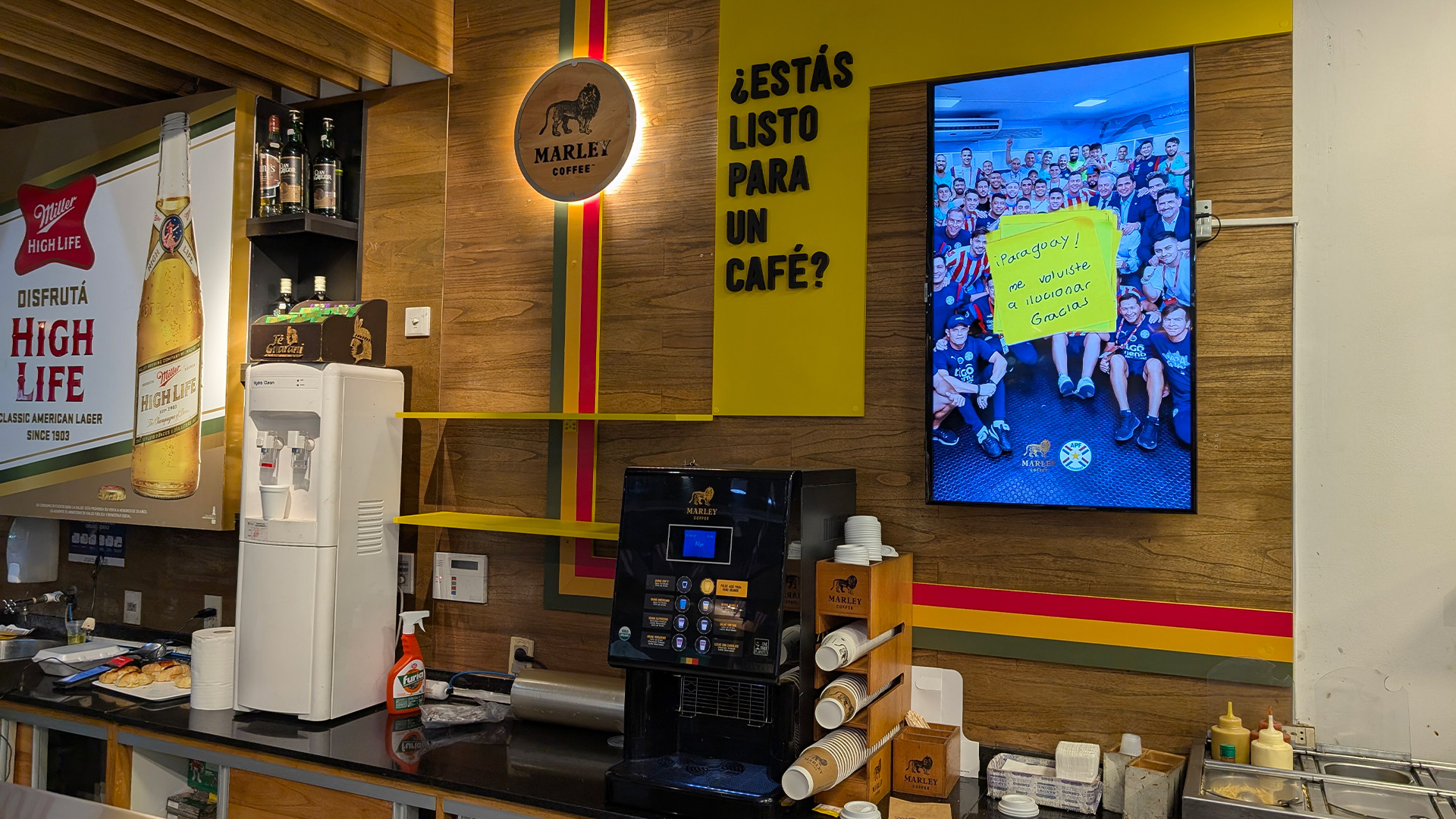 Spot para Marley Coffee ubicado en minimarket Shell de Asunción, destacando el espacio dentro del entorno, junto con los elementos visuales de la marca. Trabajo en conjunto con www.testa.com.py