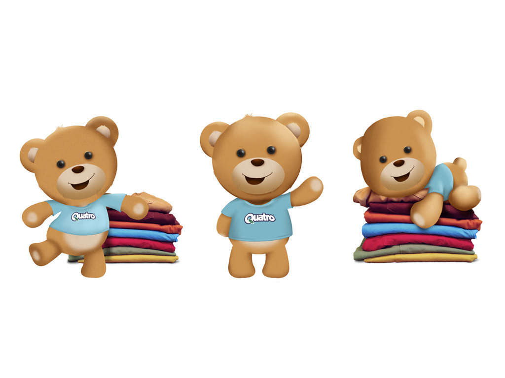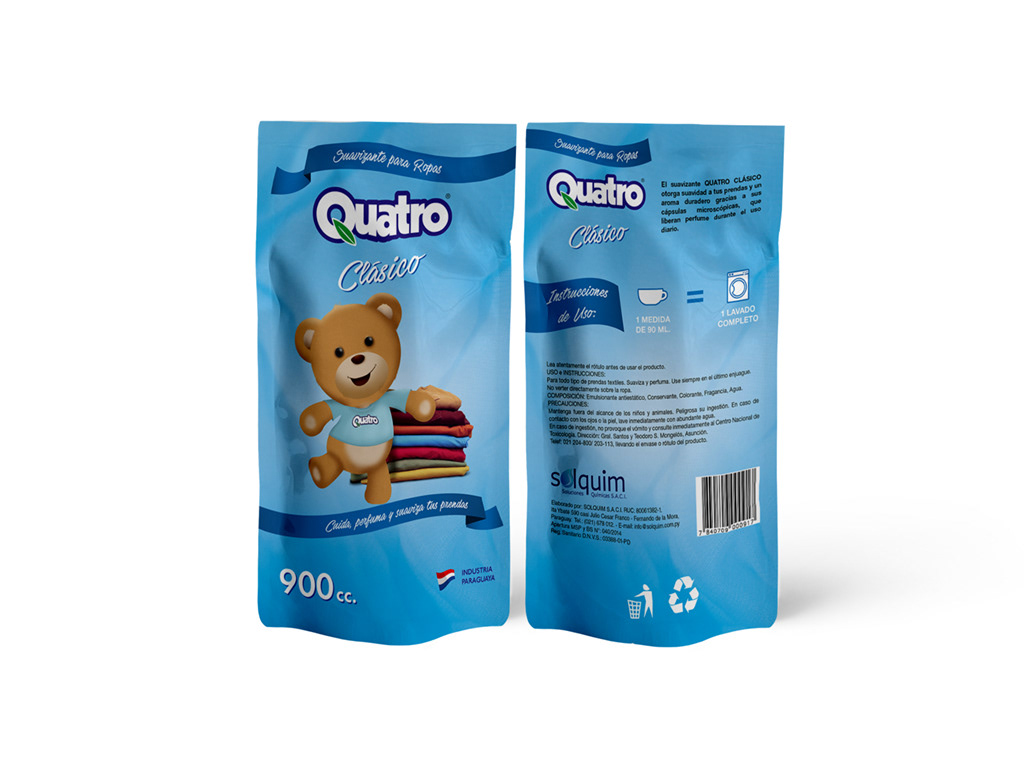 Ilustración de personaje y diseño de packaging doypack para suavizantes de ropas Quatro.